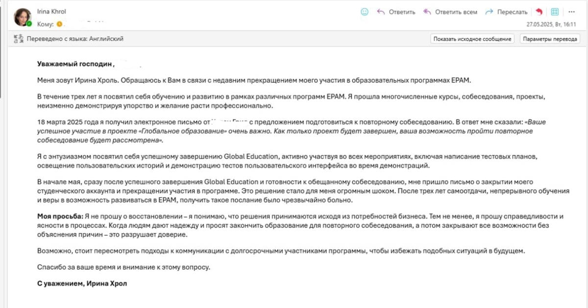 Я была в шоке и решила написать руководителю всей компании. И спустя еще два дня меня удалили из всех систем: Teams, Outlook, я потеряла доступ к EPAM Campus.